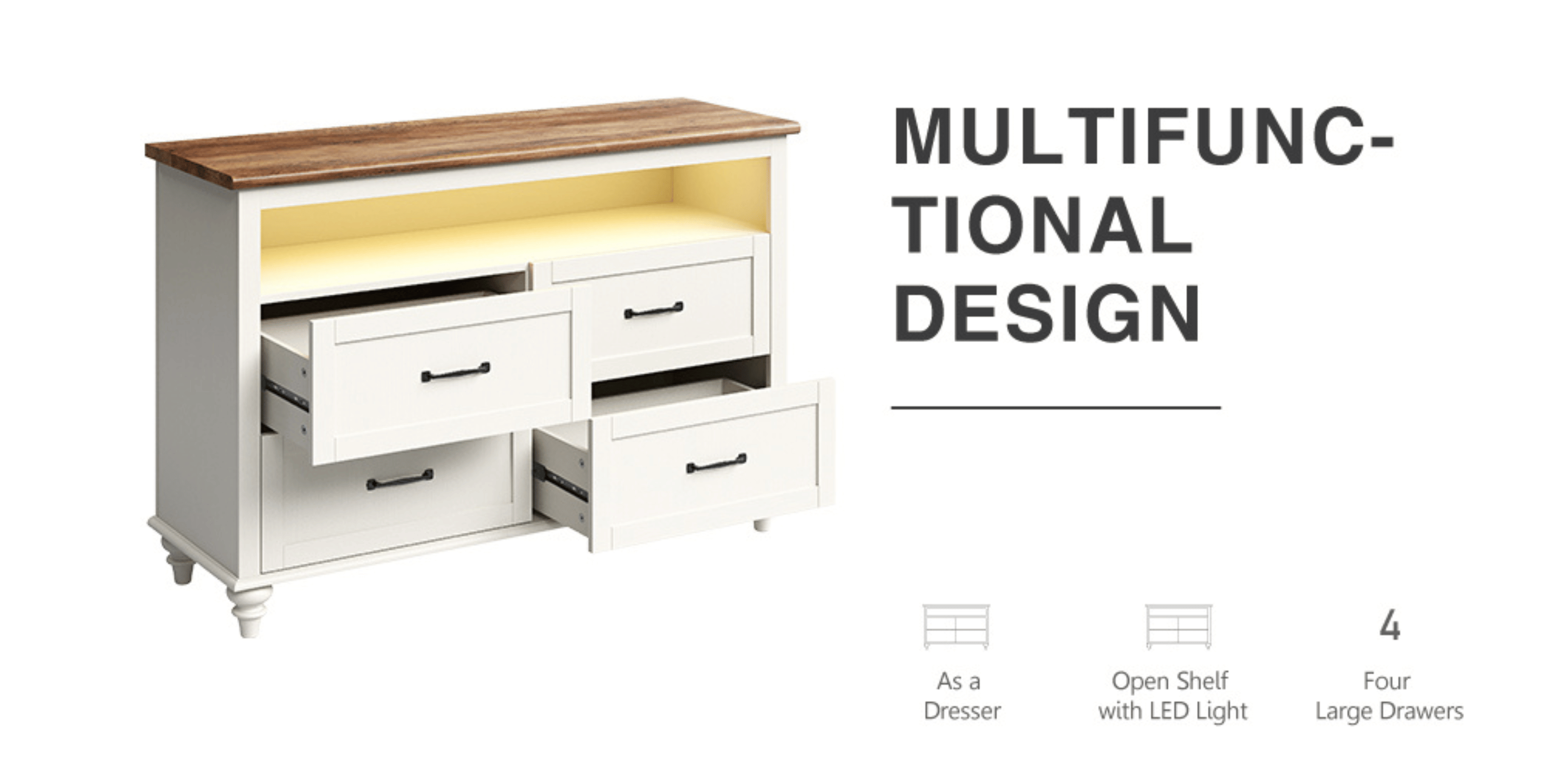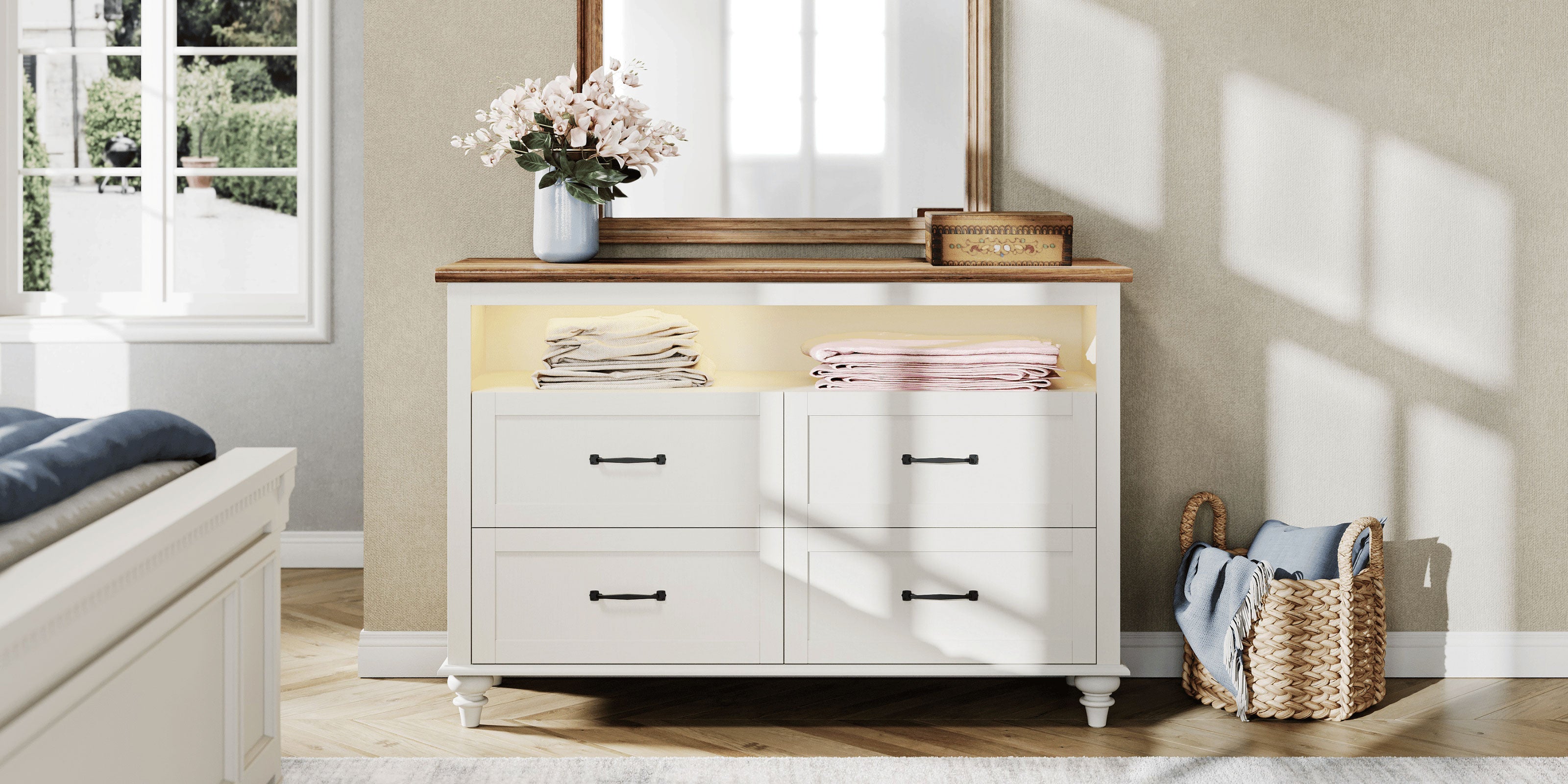 WAMPAT 48" Baby Changing Dresser for Kids Bedroom, Nursery Dresser Organizer with LED Light, Chest of Drawers for Bedroom with 4 Drawers, White