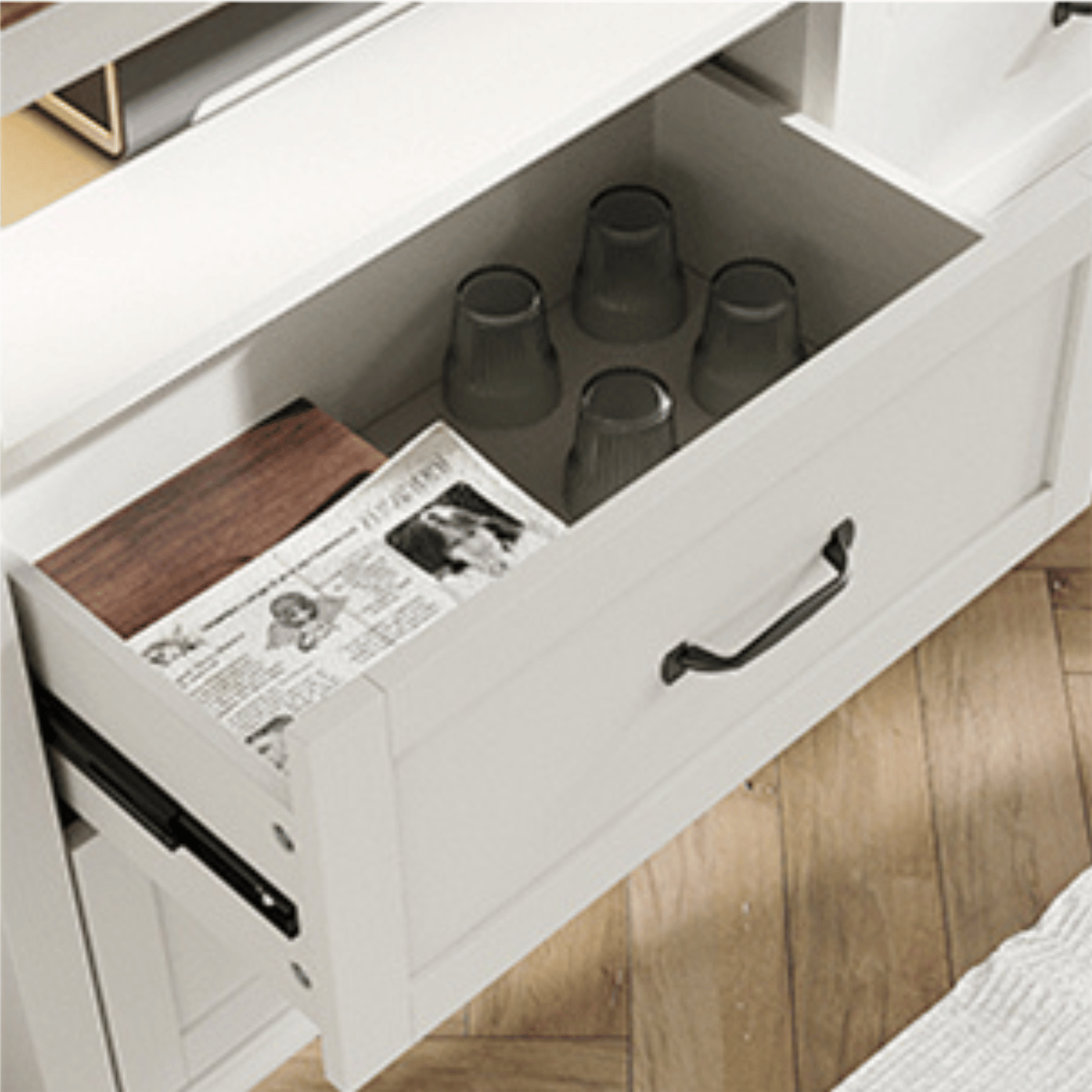 - Featuring 4 deep wood drawers and 1 large open shelf
