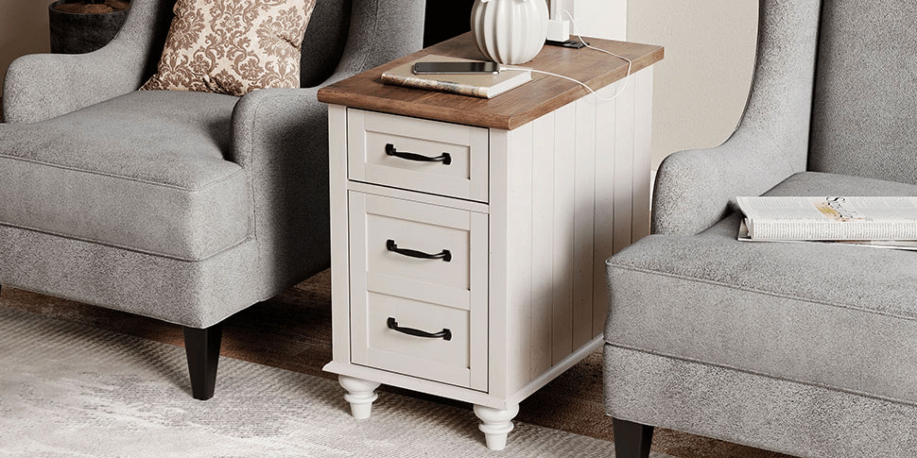 WAMPAT 24" White End Table with Charging Station, Farmhouse Side Table with Storage, 2 Power outlets & 2 USB Ports for Living Room