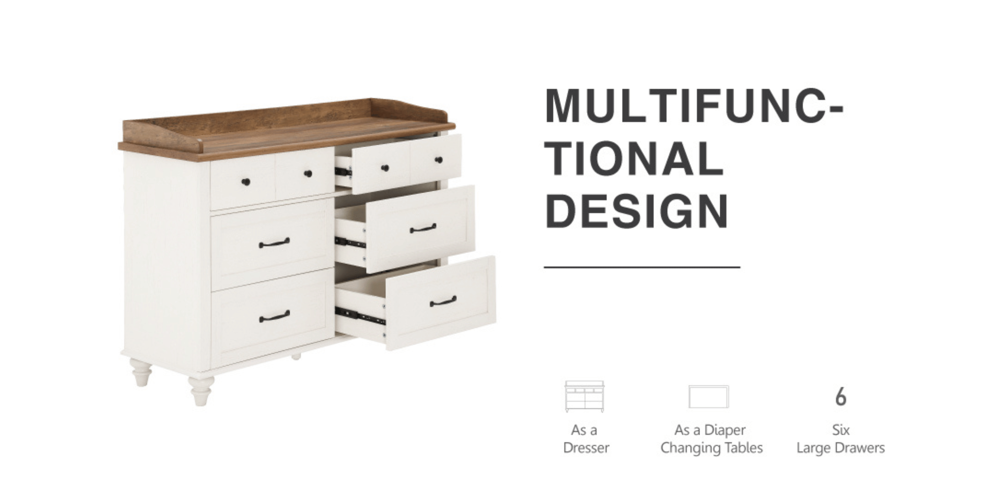 šć6 LARGE STORAGE SPACEćFeaturing 6 deep wood drawers with plenty of room for all of your baby clothing and nursery essentials. The large tabletop is perfect for displaying lamps, books, etc. And the tabletop is designed with anti-drop fence to prevent items from dropping off. Maximizes the vertical storage space while keeping your daily essentials and display decorations in order.