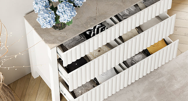 【MORE STORAGE SPACE】A mid-century modern dresser, the white dresser comes with six pull-out drawers to keep your chest of drawers organized. The thickened wooden roof adds stability to this white vanity. Provide more storage space to meet your daily use.
