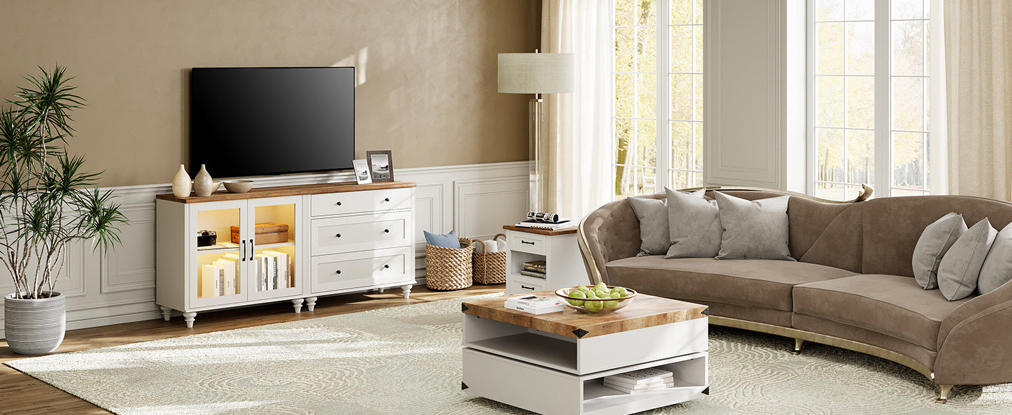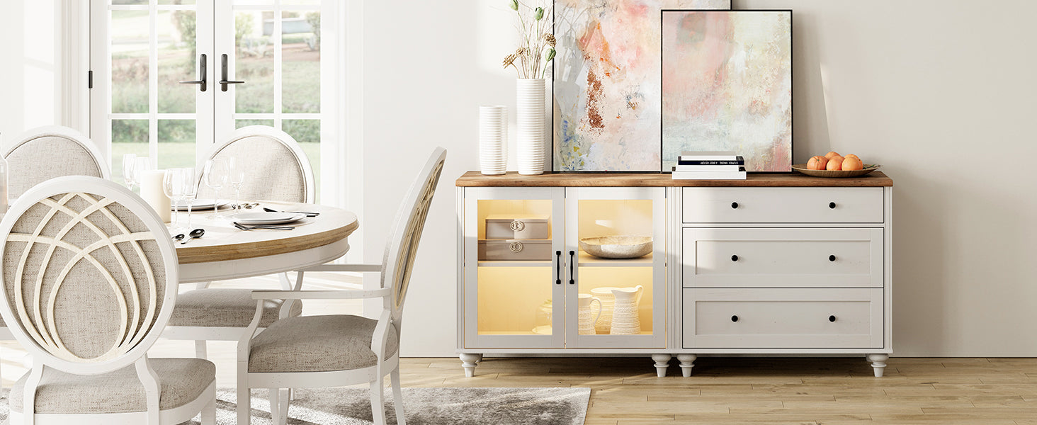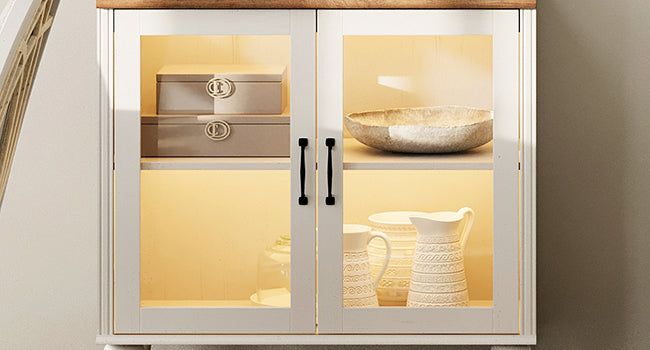 【ELEGANT STYLISH APPEARANCE】Featuring off white distressed wood surface and mid century style, the kitchen cabinet is a perfect choice to add a touch of high-end and elegant charm to your room. It will be harmoniously coordinated with any home style and show your great taste.